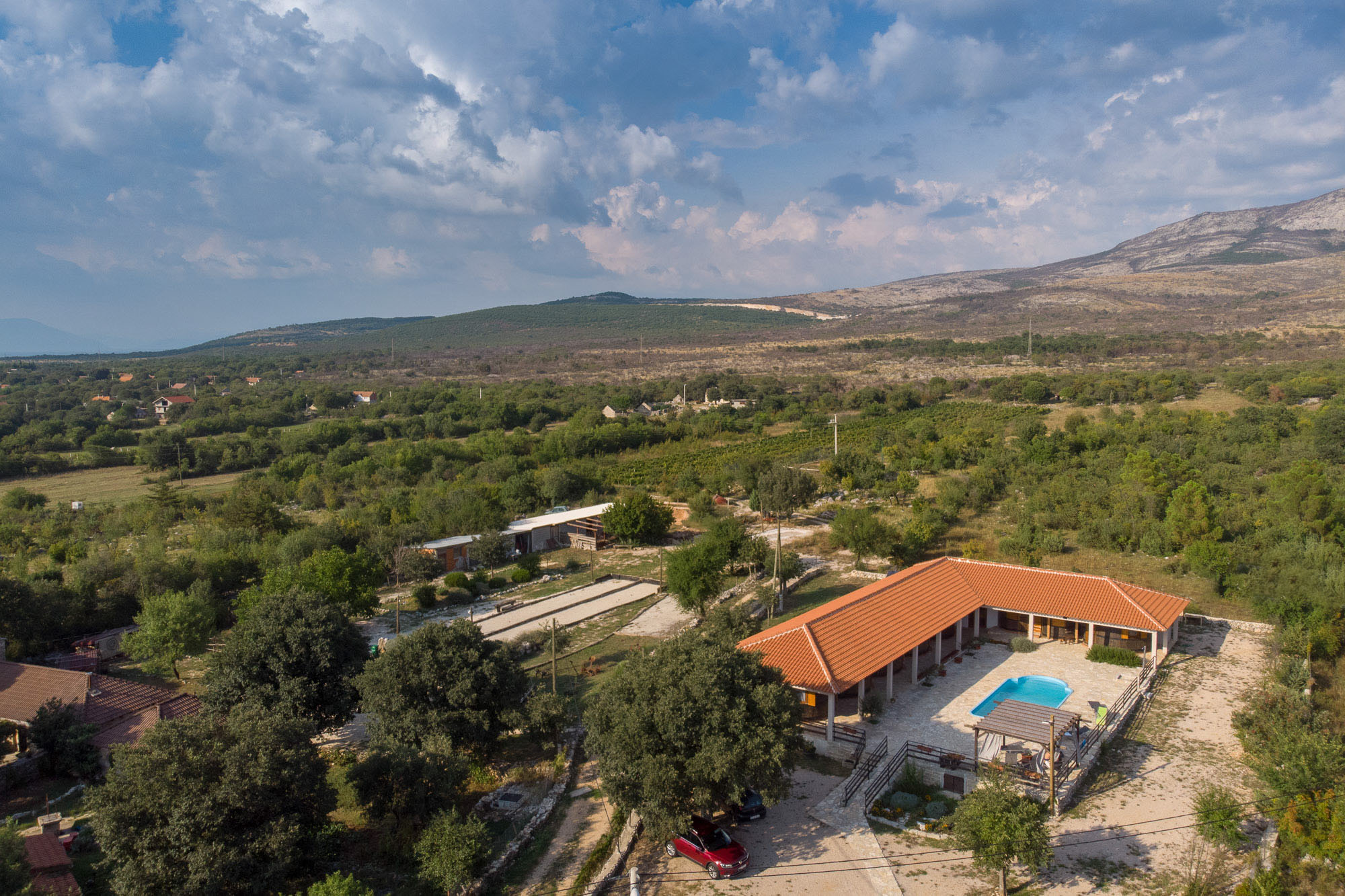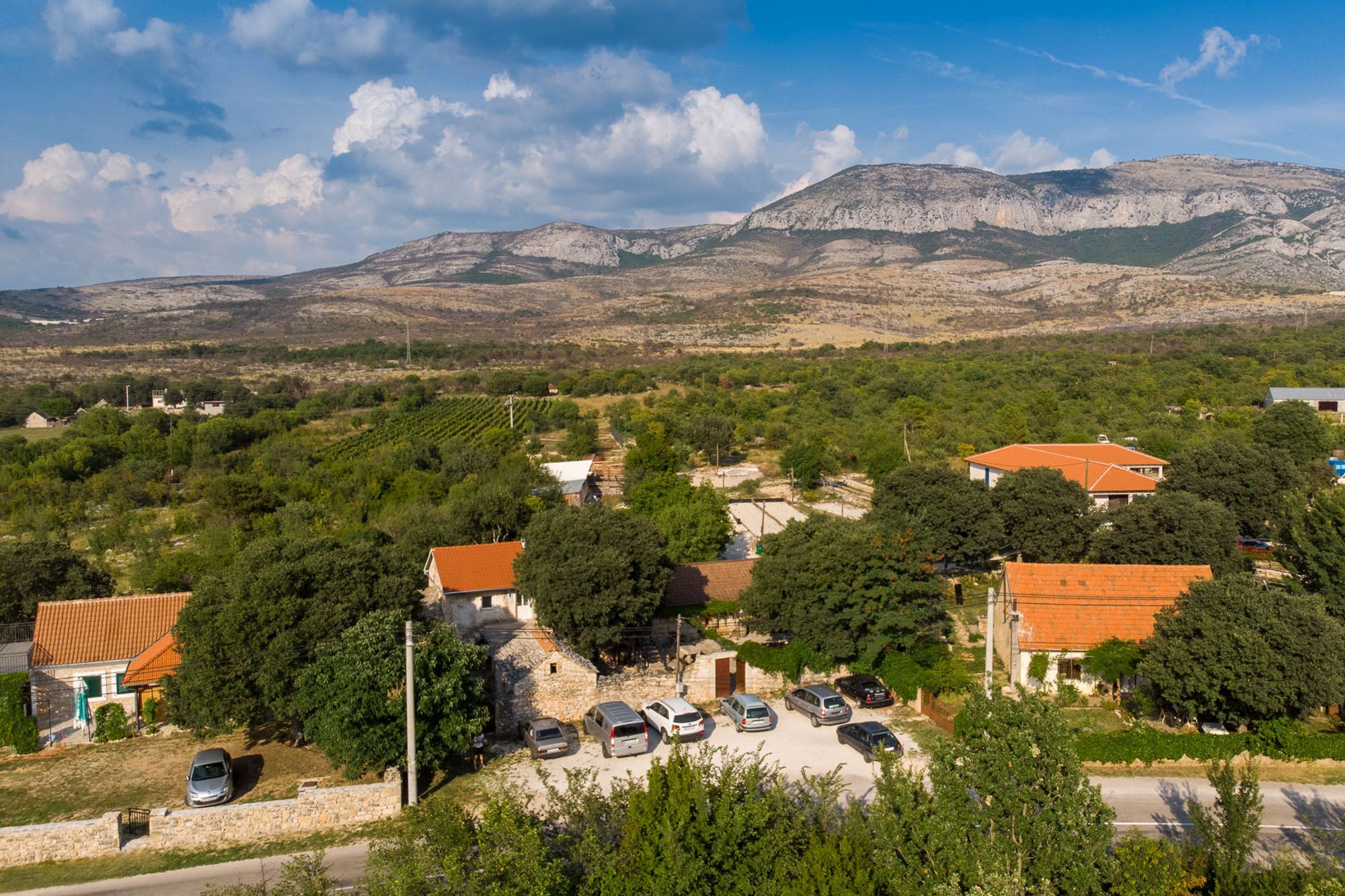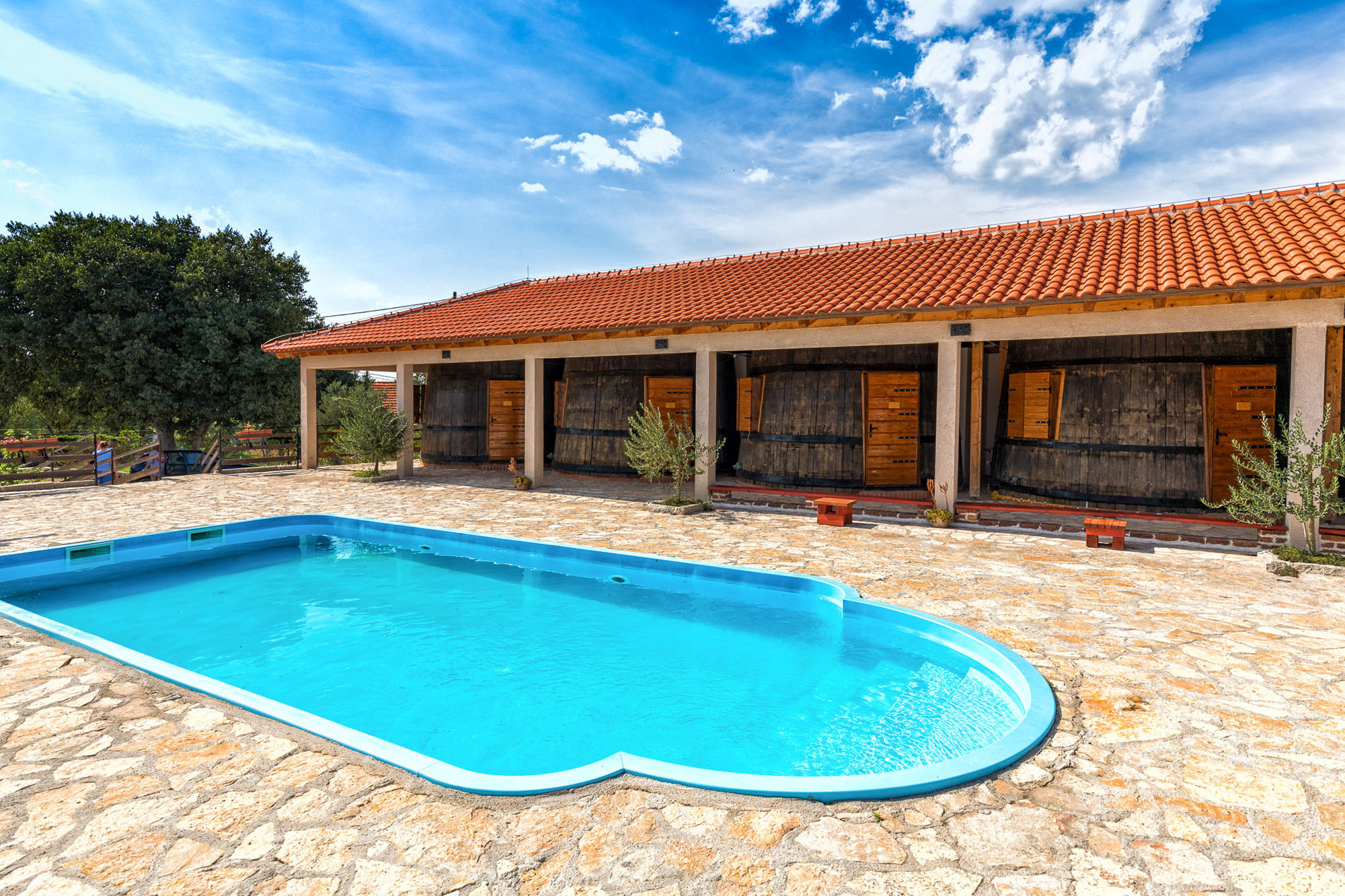 Agrotourism Duvancic is located below the Promina mountain, in the Sibenik-Knin County, 9 km from the town of Drnis, and 42 km from Sibenik (a UNESCO heritage sight), near Krka National Park. It includes vineyards over an area of 12,5 hectars, the winery that produces seven types of wine, 60 sheeps and goats, a donkey, a restaurant 'Pilipovi dvori' which offers local food, children's playground, tennis Court, unique rooms in wooden barrels (Konoba dida Marka - Grandpa Marko's Tavern) and a pool.
